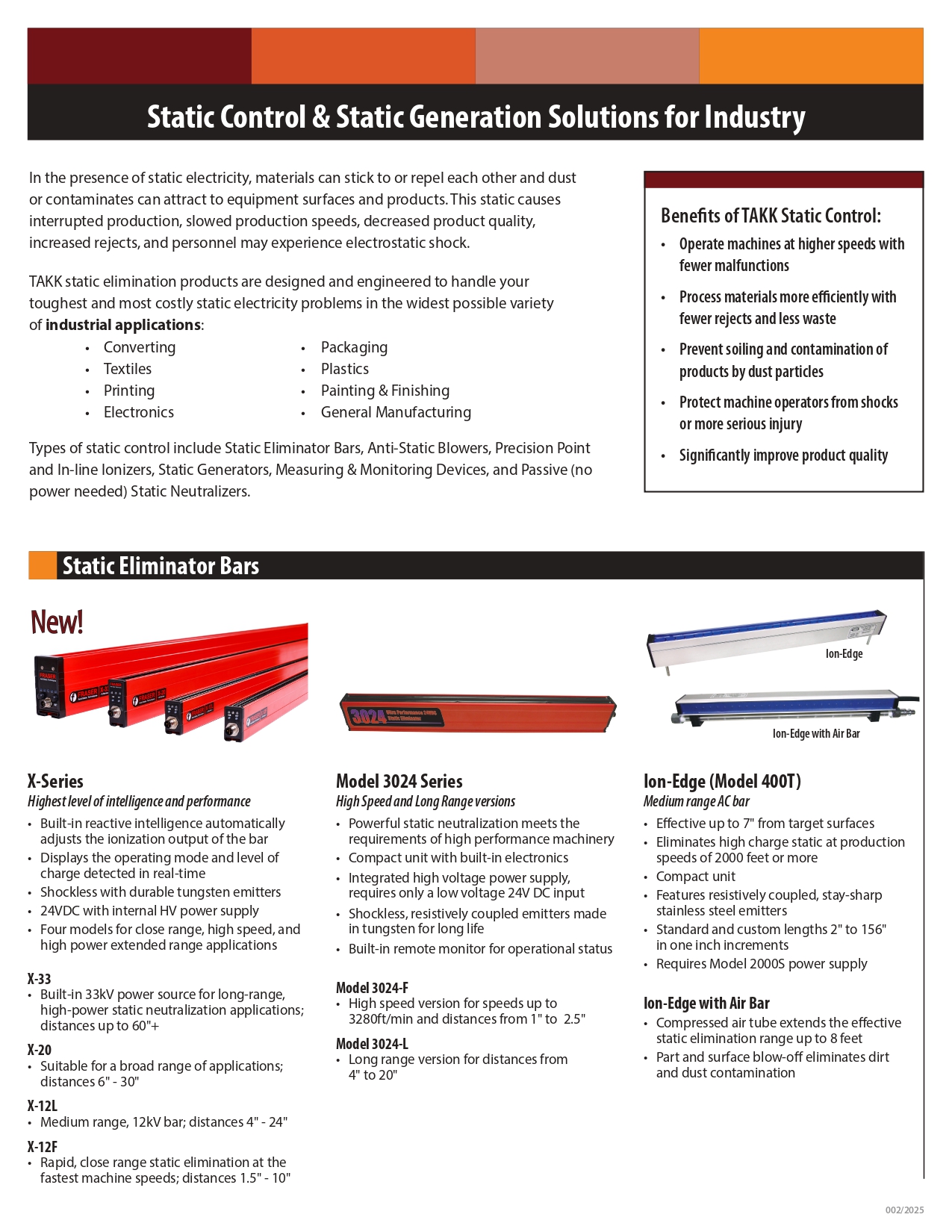 TAKK offers static eliminators and static generation products for industrial environments.TAKK Industries specializes in the manufacture and development of static control and static elimination equipment for various industrial applications. With decades of expertise, TAKK offers cost-effective solutions encompassing a wide array of high-quality products and technical support. Static electricity can lead to significant production disruptions, reduced output rates, diminished product quality, equipment damage, and safety risks for personnel. To combat electrostatic charges, TAKK’s static elimination products are utilized across a diverse range of industries and applications. These encompass converting, slitting, sheeting and winding, packaging, form-fill & seal, tamper-proof seal & sleeving, bottling, plastic processing, injection molding, film & sheet extrusion, plastic resin transport, thermoforming, electronics, circuit boards, assembly, semiconductors, textiles, printing, painting & finishing, among others.
