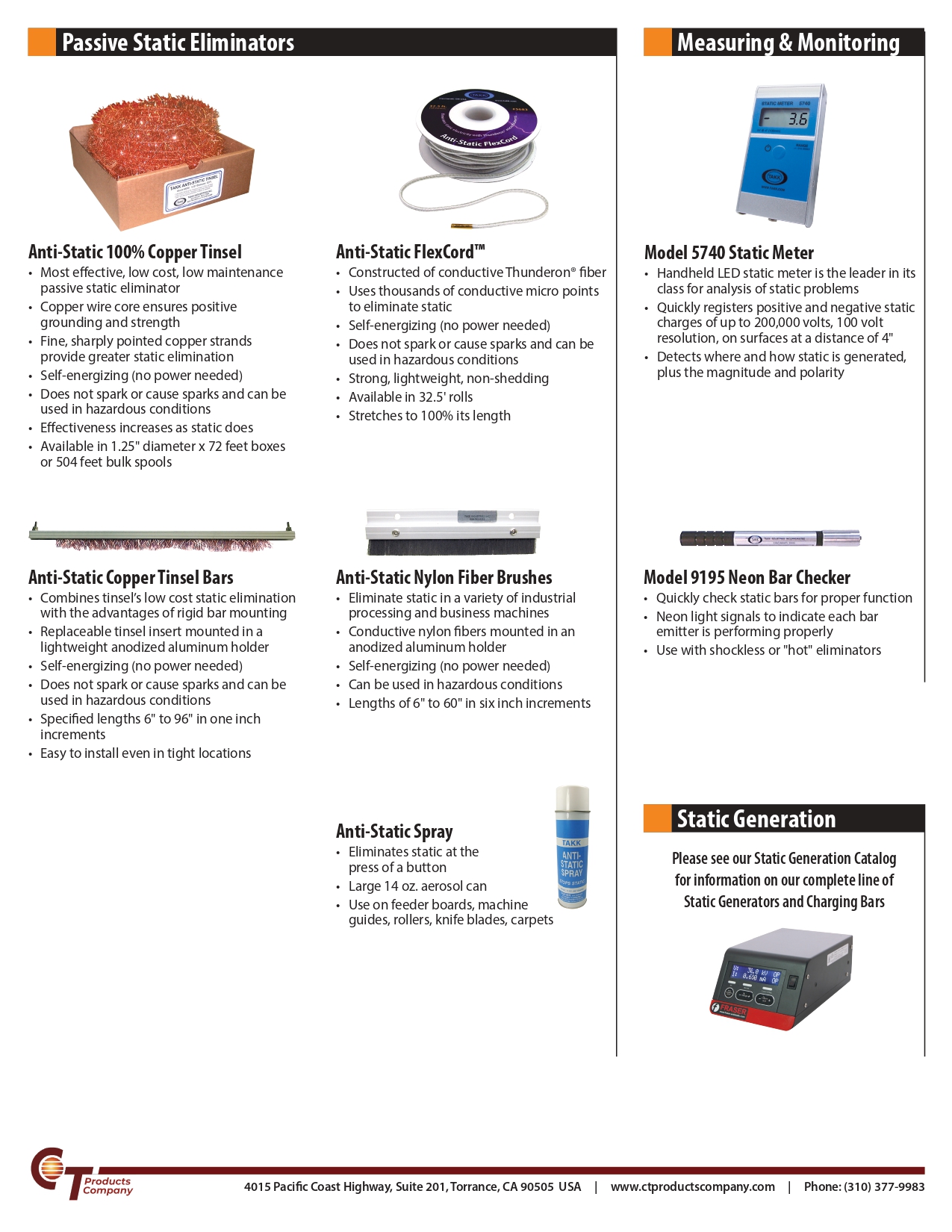 Below is the TAKK catalog of static control products, which includes Static Eliminator Bars, Anti-Static Blowers, Precision Point and Inline Ionizers, Passive Static Neutralizers, Measuring & Monitoring Devices, and Static Generators. For any inquiries or to discuss your static elimination needs, please contact C-T Products.
